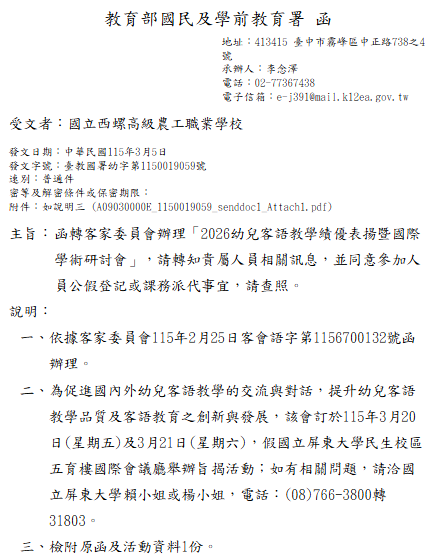 轉知-客家委員會辦理「2026幼兒客語教學績優表揚暨國際學術研討會」2026幼兒客語教學績優表揚暨國際學術研討會_Attach1下載 瀏覽次數: 7Post author:hlvs203Post published:2026-03-06Post category:研習活動Read more articles上一篇文章轉知-國立臺灣師範大學英語學系辦理115年「英語辯論評判知能線上講座」下一篇文章國立羅東高級中學辦理「生命聊天室」線上研習課程相關內容國立新竹高級中學辦理「ChatGTP融入生物教學」。2023-09-18國立高雄師範大學訂於111年10月3日辦理「性教育知能線上教師研習」,請教師踴躍報名參加。2022-09-29