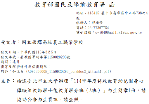 轉知-臺北市立大學辦理「114學年度特殊教育幼兒園身心障礙組教師學士後教育學分班(A班)」招生簡章114學年度特殊教育幼兒園身心障礙組教師學士後教育學分班_Attach1下載 瀏覽次數: 7Post author:hlvs203Post published:2026-03-06Post category:教職員公告Read more articles上一篇文章轉知-「115年高級中等學校閩南語文、客語文暨閩東語文教學支援老師培訓認證推動計畫」-增能課程實施計畫下一篇文章轉知-原住民族委員會「115年度獎勵推動原住民族語言有功團體及個人」作業須知等文件相關內容國立臺灣圖書館辦理「人文社會議題探究工作坊」東區場次活動案2022-06-02轉知銓敘部112年10月6日部法一字第11256217411號令2023-10-24