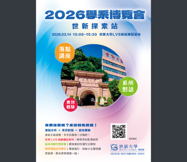 世新大學辦理「世新探索站-2026學系博覽會」活動世新大學辦理「世新探索站-2026學系博覽會」活動1下載 瀏覽次數: 6Post author:輔導室Post published:2026-03-07Post category:學生訊息 / 校園公告Read more articles上一篇文章轉知-國立臺灣師範大學英語學系辦理115年「英語辯論評判知能線上講座」相關內容國立臺灣藝術大學特殊選才招生2025-11-05【校內轉科考公告】考試地點:高一信教室2024-01-29