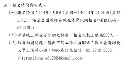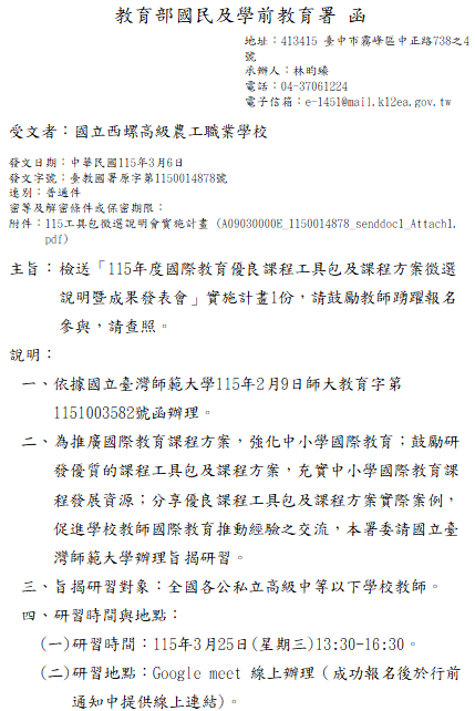 轉知-「115年度國際教育優良課程工具包及課程方案徵選說明暨成果發表會」實施計畫115-年度國際教育優良課程工具包及課程方案徵選說明暨成果發表會實施計畫_Attach1下載 瀏覽次數: 10Post author:hlvs203Post published:2026-03-09Post category:研習活動Read more articles上一篇文章轉知-體育素養導向教學評量暨『性別平等』議題融入【性別平等真『美』好,閃『躲』霸凌有技巧】教案推廣研習下一篇文章財團法人正覺教育基金會辦理生命教育教師研習活動「生命的圓滿──尋覓教師的春天」相關內容實踐大學推廣教育部辦理「西方古典藝術市場經濟學」及「如何看懂一幅畫:西方古典藝術圖像學」實體課程招生,敬請惠予公告並鼓勵所屬人員踴躍報名參加。2022-09-07逢甲大學外國語文學系舉辦「翻轉.跨文化論壇暨第八屆逢甲大學外語文教學國際學術研討會」徵稿啟事英文版、中文版各1份,鼓勵學校相關教師踴躍投稿。2021-11-22