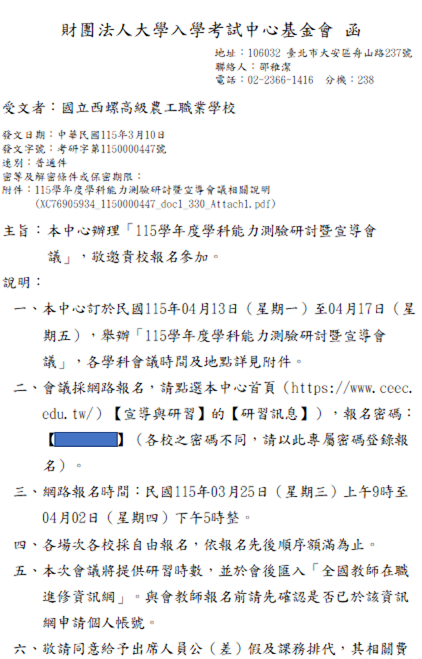 轉知-財團法人大學入學考試中心基金會辦理115學年度學科能力測驗研討暨宣導會議本校報名密碼請洽教學組。115-學年度學科能力測驗試題研討暨宣導會議_Attach1-1下載 瀏覽次數: 5Post author:hlvs203Post published:2026-03-12Post category:研習活動Read more articles上一篇文章國家科學及技術委員會辦理「2026 TechGiCS第6屆科技女 婕思」活動,請全校師學生報名參加下一篇文章轉知-長榮大學開設6門磨課師(MOOCs)春季班課程相關內容國立臺灣師範大學辦理「2023年國際資訊奧林匹亞競賽選訓營」初選相關資訊,詳如說明2023-02-13財團法人大學入學考試中心基金會大學入學考試中心辦理「112學年度起適用之大學入學考試宣導會議-社會科」。2023-09-19