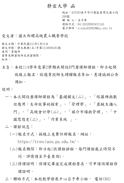 轉知-靜宜大學114學年度第2學期開設8門磨課師課程 瀏覽次數: 7Post author:hlvs203Post published:2026-03-13Post category:學生訊息 / 研習活動Read more articles上一篇文章轉知-國立臺南女子高級中學人權教育資源中心辦理「Z世代下載中」戲劇工作坊暨公開展演下一篇文章【轉知】教育部國民及學前教育署辦理「115年度高級中等學校學生會成果觀摩活動」相關內容臺中市立臺中女子高級中等學校教育部地理學科中心訂於111年11月28日(一)辦理「跨學科/跨領域課程方案系列研習 資訊科技應用於社會領域課程教學」,鼓勵社會科教師參與。2022-11-17輔仁大學開設磨課師線上課程「生命電影院─電影中的疾病與 人生」,即日起開放線上報名,敬請踴躍報名修課。2024-10-13