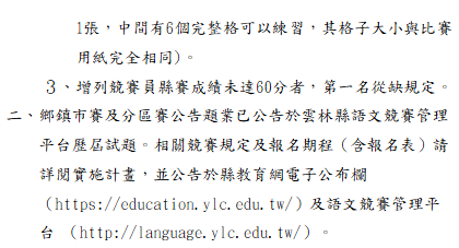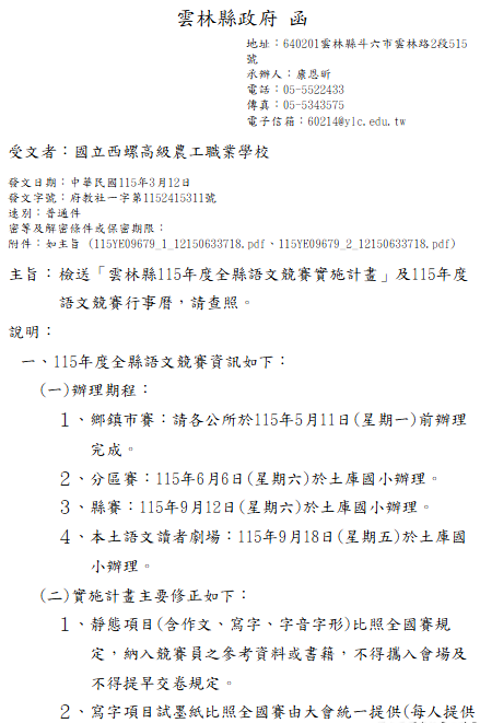 轉知-「雲林縣115年度全縣語文競賽實施計畫」及115年度語文競賽行事曆雲林縣115年度全縣語文競賽實施計畫下載雲林縣115年度全縣語文競賽行事曆下載 瀏覽次數: 8Post author:hlvs203Post published:2026-03-13Post category:教職員公告Read more articles上一篇文章財團法人嘉新兆福文化基金會「115年度嘉新獎學金」相關內容國家文官學院為推動公務人員終身學習及閱讀風氣,規劃辦理113年度公務人員「每月一書」遴選2023-05-12轉知:國教署性別平等教育資源中心發展性別平等教育之學習卡、海報及推薦書單,請轉知校內教師參考運用。2025-05-06