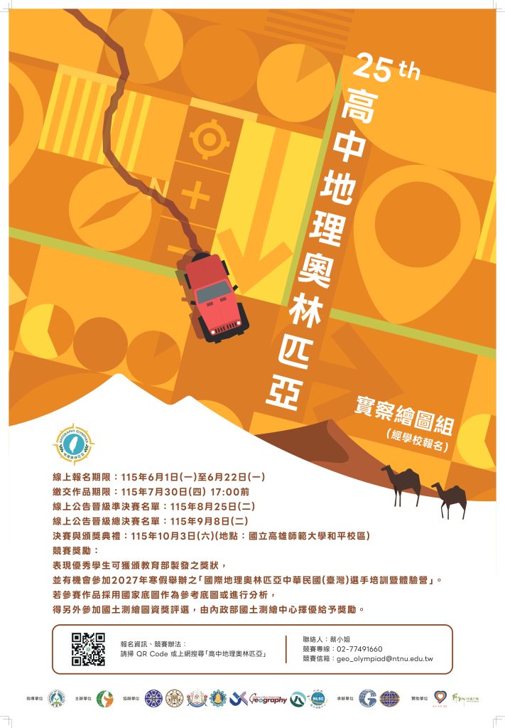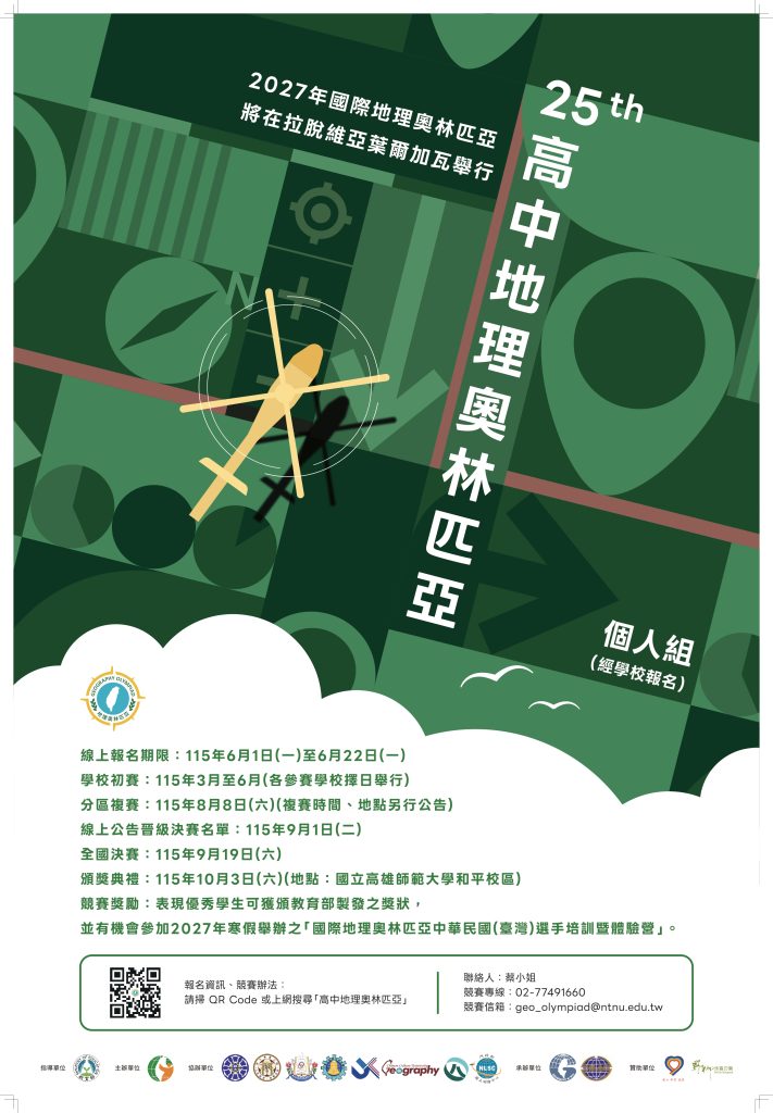 【轉知】中華民國地理學會辦理「115年第25屆高中地理奧林匹亞競賽」相關資料教育部國民及學前教育署-函-7下載中華民國地理學會函下載競賽辦法下載 瀏覽次數: 3Post author:hlvs302aPost published:2026-03-13Post category:學生訊息Read more articles上一篇文章【轉知】國立政治大學東南亞語文學系、社團法人印尼之友協會,與社團法人高雄市東南亞產學交流協會合作辦理之「115年東南亞語言說故事競賽」相關內容雲林縣政府有關114年全國語文競賽內容第1次修正案,業已公告於114年度全國語文競賽網站。2025-09-08110學年度第1學期學藝競賽比賽時間、地點公告2021-11-08