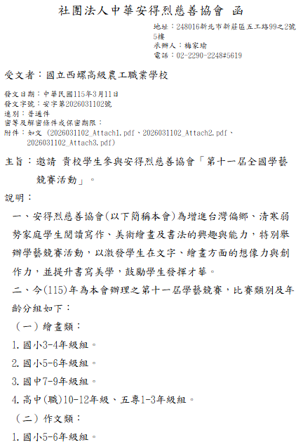 轉知-安得烈慈善協會「第十一屆全國學藝競賽活動」安得烈慈善協會「第十一屆全國學藝競賽活動」_Attach1下載安得烈慈善協會「第十一屆全國學藝競賽活動」_Attach2下載安得烈慈善協會「第十一屆全國學藝競賽活動」_Attach3下載 瀏覽次數: 2Post author:hlvs203Post published:2026-03-13Post category:學生訊息 / 宣導資訊Read more articles上一篇文章轉知-轉知FICHET臺灣華語教育資源中心新增華語補充教材「輕鬆說華語2」下一篇文章【轉知】中央研究院參與「臺灣橋梁計畫」(TAIWAN BRIDGES)邀請諾貝爾獎得主愛德華.莫澤(Edvard I. Moser)博士蒞院發表專題演講相關內容110學年度第2學期轉科考試錄取分發結果2021-12-29台南家專學校財團法人台南應用科技大學舉辦2024第一屆「南應盃」全國原創漫畫大賽2024-04-10