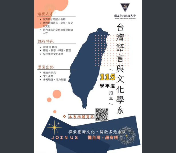國立臺北教育大學台灣語言與文化學系將於115學年度正式招生國立臺北教育大學台灣語言與文化學系將於115學年度正式招生1下載國立臺北教育大學台灣語言與文化學系將於115學年度正式招生2下載 瀏覽次數: 3Post author:輔導室Post published:2026-03-15Post category:學生訊息 / 校園公告Read more articles上一篇文章明志科技大學115學年度運動績優學生單獨招生相關資訊下一篇文章國立臺東大學115學年度原住民專班招生相關訊息相關內容文藻學校財團法人文藻外語大學西班牙語文系舉辦「2024文藻盃西語競賽」,敬請惠予協助公告2024-08-30鴻合興精密工業股份有限公司徵才詳如附件2022-09-23