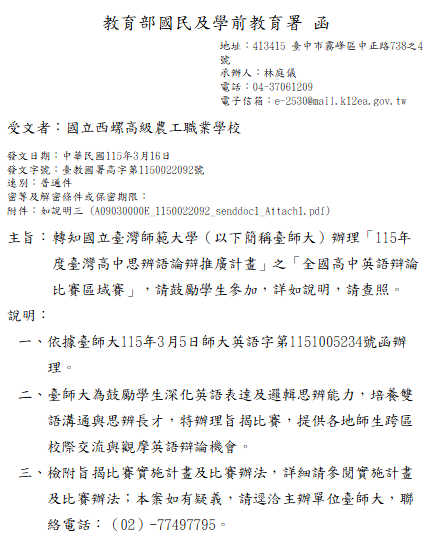 轉知-全國高中英語辯論比賽區域賽「115-年全國高級中等學校英語辯論比賽—區域賽與全國賽」實施計畫_Attach1下載 瀏覽次數: 9Post author:hlvs203Post published:2026-03-17Post category:宣導資訊Read more articles上一篇文章轉知:教育部函轉財團法人犯罪被害人保護協會建置「開放式轉介平臺」相關資訊,詳如附件,敬請參閱。相關內容國立東華大學舉辦「2024縱谷營:章魚的洄瀾遊記」2024-04-26國立中央大學列 45》—— 「人類與環境交互作用中的地理空間人工智慧」2025-02-20