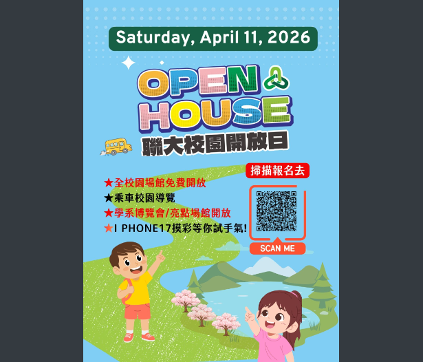 【轉知】國立聯合大學辦理「2026年國立聯合大學OPEN HOUSE校園開放日」活動資訊國立聯合大學-函下載報名資訊下載 瀏覽次數: 8Post author:hlvs302aPost published:2026-03-20Post category:學生訊息Read more articles上一篇文章【轉知】嘉義縣政府辦理「2026第一屆『中寮安溪城隍廟盃』全國書法比賽」下一篇文章【轉知】銘傳大學辦理「114學年度電機資訊學院高中體驗營」相關內容東吳大學外國語文學院英文學系、日本語文學系與德國文化學系聯合線上招生說明會2026-02-24「AI應用體驗營」2022-03-17