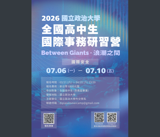 【轉知】國立政治大學外交學系「2026全國高中生國際事務研習營」國立政治大學-函-1下載 瀏覽次數: 6Post author:hlvs302aPost published:2026-03-20Post category:學生訊息Read more articles上一篇文章【轉知】銘傳大學辦理「114學年度電機資訊學院高中體驗營」下一篇文章【公告】114-2綜高一轉學程申請辦法及試聽學程申請表相關內容國立中興大學113年暑假UniMath 高等數學探索營、AI生成式創意繪圖營隊招生海報與簡章2024-05-06教育部國民及學前教育署修正後2024年「總統教育獎歷屆獲獎者─『生命教育講師』生命故事文藝賞」徵選計畫1份2024-11-19