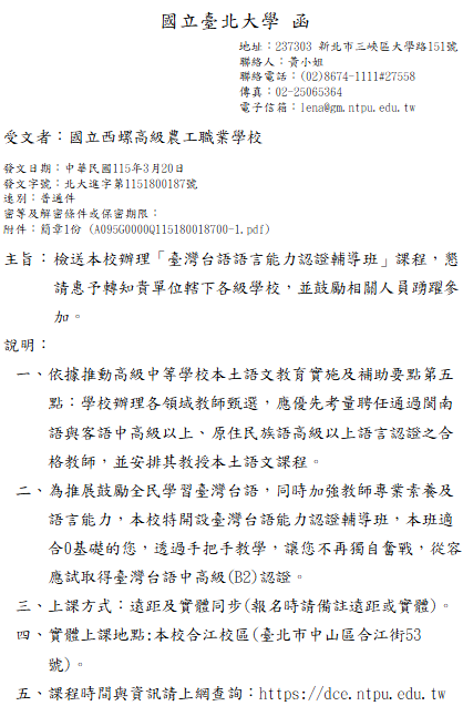轉知-國立臺北大學辦理「臺灣台語語言能力認證輔導班」課程課程時間與資訊請上網查詢:https://dce.ntpu.edu.tw/list.php?p=2306第-811-期臺灣台語語言能力認證【輔導班】下載 瀏覽次數: 7Post author:hlvs203Post published:2026-03-23Post category:研習活動Read more articles上一篇文章轉知-國立臺南大學辦理「B2-PBL教學應用工作坊」時間調整為115年6月13日(星期六)下一篇文章轉知-「教育部115年度校園開放文件格式(ODF)競賽」及推廣研習課程相關內容財團法人大學入學考試中心基金會大學入學考試中心辦理「112學年度起適用之大學入學考試宣導會議-歷史科」。2023-09-13國立中央大學台灣電影研究中心為推廣影像教育,將於2022年7月6日舉辦「2022電影《回程列車》教師研習暨教具包分享會」, 鼓勵教師踴躍報名。2022-06-02
