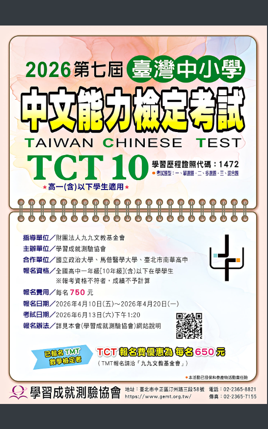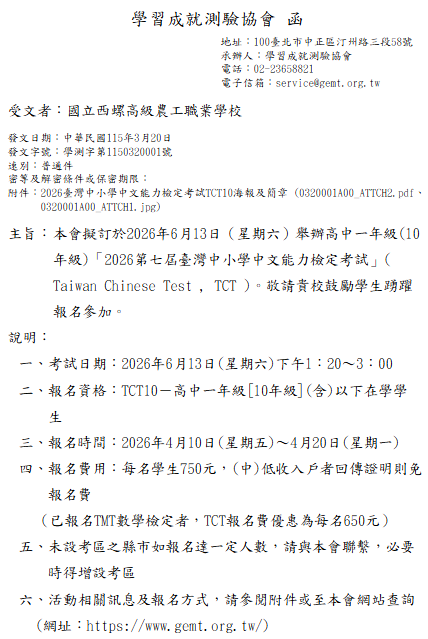 轉知-學習成就測驗協會舉辦高中一年級「2026第七屆臺灣中小學中文能力檢定考試」活動相關訊息及報名方式,請參閱附件或至本會網站查詢(網址:https://www.gemt.org.tw)2026第七屆臺灣中小學中文能力檢定考試_ATTCH2下載 瀏覽次數: 6Post author:hlvs203Post published:2026-03-23Post category:學生訊息 / 宣導資訊Read more articles上一篇文章轉知-第十屆臺灣中小學數學能力檢定考試下一篇文章轉知-「教育部115年度校園開放文件格式(ODF)競賽」及推廣研習課程相關內容轉知-西螺廣福宮115年創意年畫書法比賽辦法2026-01-15114年流感家長線上同意書2025-09-26