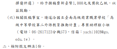 轉知-115年度「高級中等學校第二外語教育推動計畫」電子報徵文115年度「高級中等學校第二外語教育推動計畫」電子報徵文_Attach1下載 瀏覽次數: 7Post author:hlvs203Post published:2026-03-24Post category:宣導資訊Read more articles上一篇文章轉知-「教育部115年度校園開放文件格式(ODF)競賽」及推廣研習課程下一篇文章轉知-IVY CUP常春藤大學聯盟國際口語大賽相關內容教育部國民及學前教育署修正後2024年「總統教育獎歷屆獲獎者─『生命教育講師』生命故事文藝賞」徵選計畫1份2024-11-19轉知:行政院113年12月2日上午9時至12月31日下午5時舉行「113年性平觀察家養成挑戰有獎徵答」社會組個人競賽活動,鼓勵教職員工生及家長踴躍參加,詳如附件,敬請參閱。2024-12-27