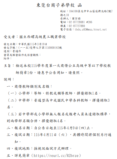 轉知-東莞台商子弟學校115學年度第一次商借公立高級中等以下學校教師簡章詳見簡章(https://reurl.cc/R2brze) 瀏覽次數: 5Post author:hlvs203Post published:2026-03-24Post category:教職員公告Read more articles上一篇文章國立臺灣師範大學辦理115年度中等教育季刊徵稿下一篇文章轉知-教育部115學年度徵聘商借教師3名辦理師資培育及藝術教育相關業務相關內容轉知外交部領事事務局出版新編113年度「為民服務白皮書」(第25期)之電子檔已置於該局全球資訊網(網址:https://www.boca.gov.tw;首頁/為民服務專區/為民服務白皮書),並可以掃描所附QR Code下載參2025-04-08公告本校新修訂之職員獎懲實施要點,並自即日起實施。2024-04-15