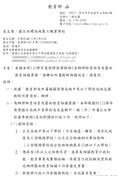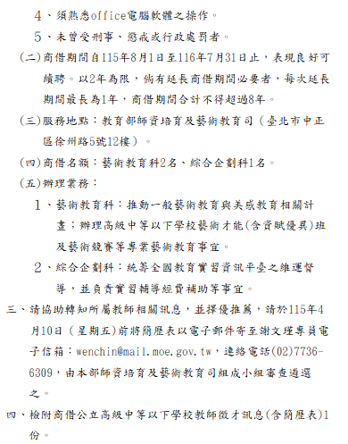 轉知-教育部115學年度徵聘商借教師3名辦理師資培育及藝術教育相關業務教育部115學年度徵聘商借教師3名_Attach1下載教育部115學年度徵聘商借教師3名_Attach2下載 瀏覽次數: 5Post author:hlvs203Post published:2026-03-24Post category:教職員公告Read more articles上一篇文章轉知-東莞台商子弟學校115學年度第一次商借公立高級中等以下學校教師簡章下一篇文章【轉知】行政院人權及轉型正義處為促進轉型正義教育業務推動,已取得7支轉型正義相關議題影片之限期或限場次公開播映權利相關內容行政院環境保護署檢送「112年臺美生態學校計畫說明會」簡章1份,請踴躍報名參加。2023-02-14教育部國民及學前教育署補助辦理新住民子女教育要點」第3點、第9點,業經本署於中華民國114年6月10日以臺教國署原字第1145701272A號令修正發布,茲檢送發布令影本及行政規則修正規定各1份。2025-06-11