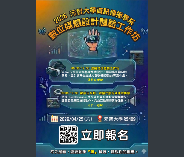 【轉知】元智大學辦理「數位媒體設計」體驗工作坊元智大學-函下載 瀏覽次數: 7Post author:hlvs302aPost published:2026-03-24Post category:學生訊息Read more articles上一篇文章【轉知】教育部國民及學前教育署「教育部高級中等學校學生新世紀領導人才第25期初階培育營」報名截止日期延至115年4月12日(星期日)23時59分止,以網站後臺時間為憑下一篇文章【轉知】國立中山大學外國語文學系114學年度暑期外文營隊訊息相關內容中華民國汽車安全協會「安全GO兔U」交通安全大競賽─112年度全國交通安全貼圖設計競賽活動,鼓勵本校學生踴躍報名參加。2023-03-02虎尾科技大學辦理勞動部「113年度產業新尖兵計畫」課程「封測產業人才培育訓練班(第三期)」、「太陽 光電設置技術士訓練班(第五期)」及「智慧製造應用暨機 器手臂考照實務培訓班」三班2024-06-05