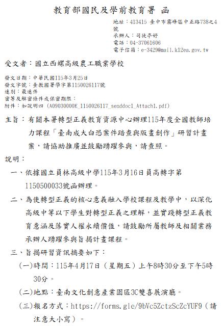 轉知-115年度全國教師培力課程「臺南成大白恐案件踏查與版畫創作」研習報名方式:https://forms.gle/9bVc5ZctzScZcYUF9(請注意大小寫)「臺南成大白恐案件踏查與版畫創作」研習活動實施計畫_Attach1下載 瀏覽次數: 5Post author:hlvs203Post published:2026-03-25Post category:研習活動Read more articles上一篇文章轉知-「超安全高中生」機車騎乘及「超安全駕駛」汽車駕駛交通安全線上課程開課計畫下一篇文章轉知-「生成式AI對數位素養的挑戰」數位學習增能課程相關內容歷史學科中心及財團法人影想文化藝術基金會聯合辦理111學年度《時光講堂》II :打開時光的手箱,尋找昭和時期的愛與鄉愁,鼓勵歷史科教師踴躍報名參加。2022-10-14國立陽明交通大學辦理從教學現場找解方:跨領域專業教師增能系列講座研習。2023-10-12