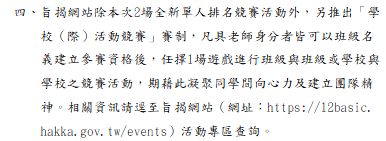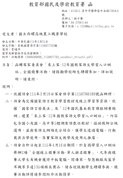 轉知-「來上客-12年國教客語文學習入口網站」全國競賽活動相關資訊請逕至旨揭網站(網址:https://12basic.hakka.gov.tw/events)活動專區查詢「來上客-12-年國教客語文學習入口網站」全國線上競賽活動活動簡章下載 瀏覽次數: 5Post author:hlvs203Post published:2026-03-25Post category:學生訊息 / 宣導資訊Read more articles上一篇文章轉知-115年度雲林縣推動臺美生態學校輔導認證說明會相關內容雲林縣政府辦理雲林縣113年度臺灣閱讀節活動~「大家一起來說故事比賽」2024-10-29國立中興大學113年暑期「國高中營- 英文網紅速成班~Fun心開口說英文!、Blender 3D初探全攻略、角色設計與插畫」招生2024-05-31