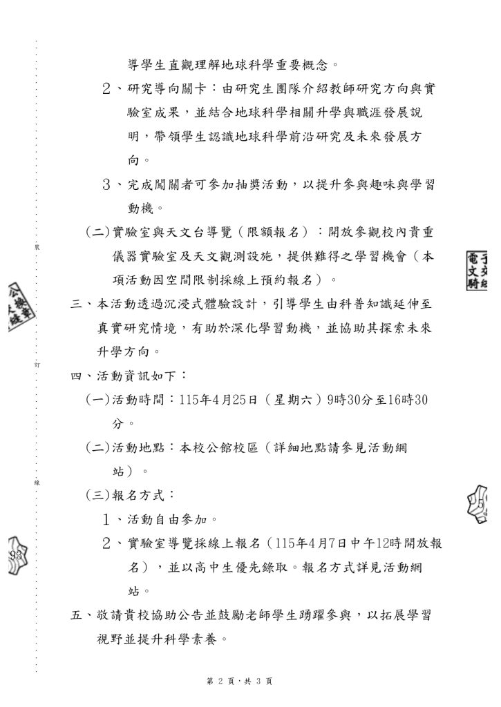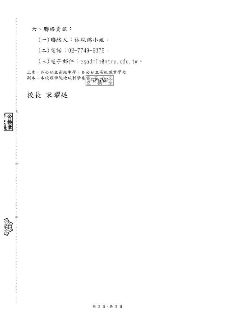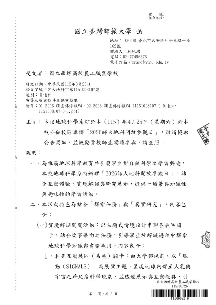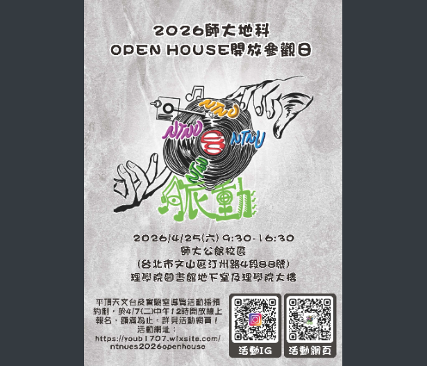 【轉知】國立臺灣師範大學地球科學系訂於本(115)年4月25日(星期六)於公館校區舉辦「2026師大地科開放參觀日」1151008107-0-1下載 瀏覽次數: 4Post author:hlvs302aPost published:2026-03-26Post category:學生訊息Read more articles上一篇文章114學年度第一學期警察子女獎助學金下一篇文章115年度獎助學金(含【The Shiner清寒獎助學金】及【火炬助學計畫】)申請標準及辦法相關內容財團法人大學入學考試中心基金會大學入學考試中心製作111學年度分科測驗試務及各考科簡介之相關影片,置於本中心首頁「宣導與研習/簡報與短片」專區,歡迎觀覽。2022-05-27青年Talk SDGs—有「難」同當-國際援助x難民議題大解密2023-11-06