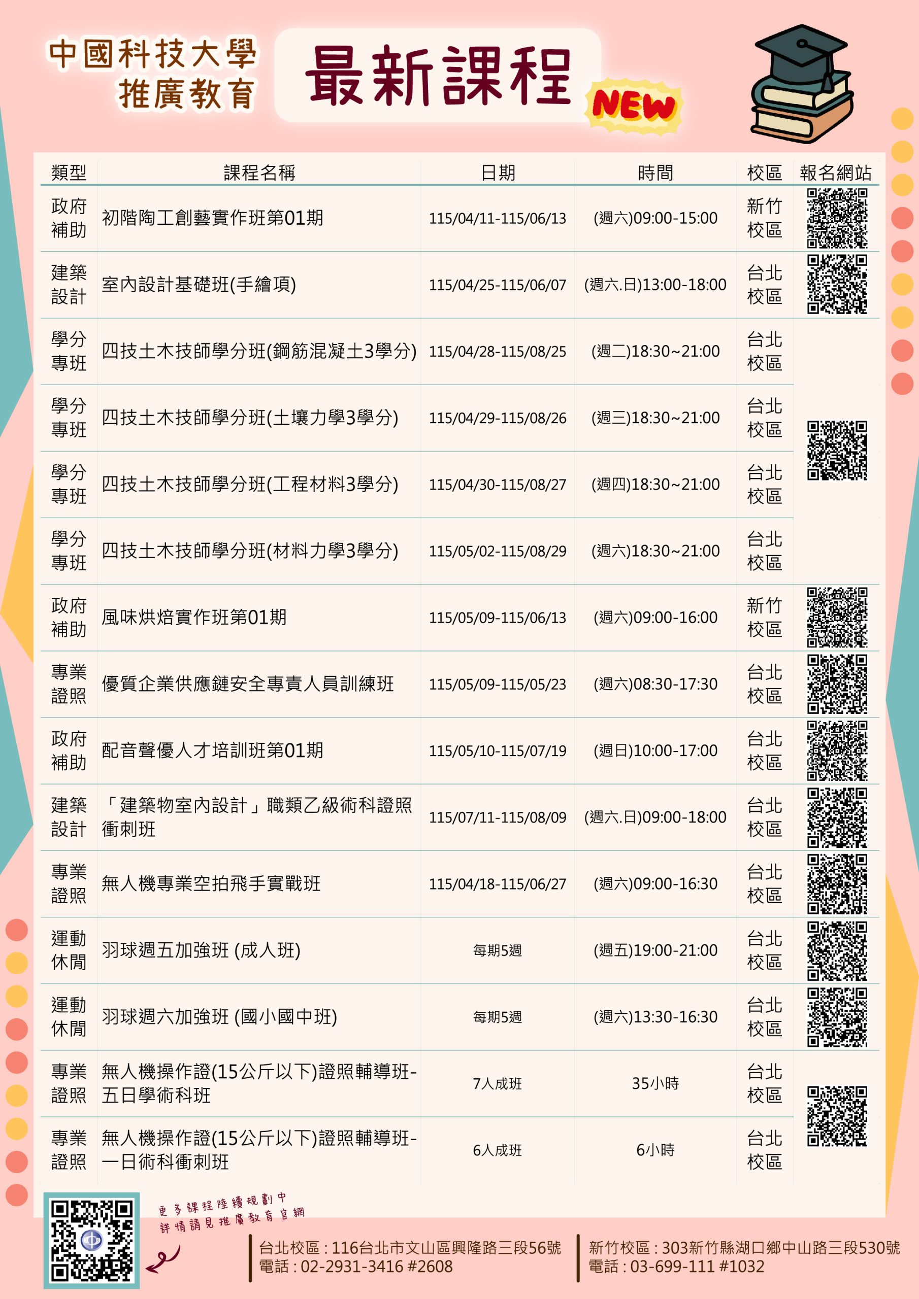 三、課程詳細資訊請掃描海報所附QR Code,或逕至本校推廣教育中心官方網站查詢(https://cec.cute.edu.tw/)。