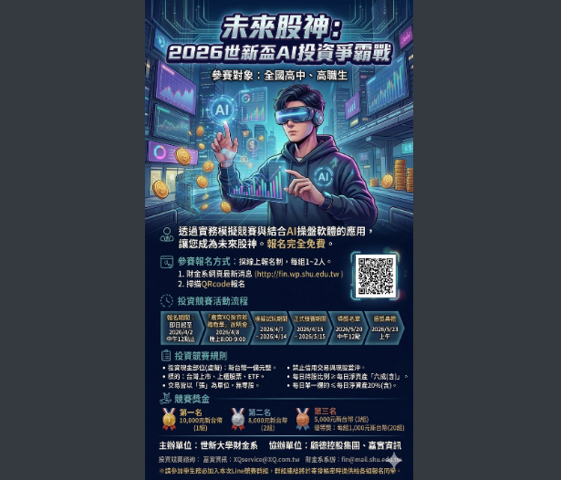 【轉知】世新大學辦理「未來股神:2026世新盃AI投資爭霸戰」世新大學-函下載未來股神:2026世新盃AI投資爭霸戰下載 瀏覽次數: 8Post author:hlvs302aPost published:2026-03-31Post category:學生訊息Read more articles上一篇文章【轉知】客家委員會(下稱該會)辦理之「2026客家合唱比賽」及「現代阿卡貝拉表演賽」下一篇文章【轉知】國立中興大學植物病理學系辦理『第二十六屆植物病理暨微生物研習營』相關內容聯合數位文創股份有限公司訂於113年6月14日~113年10月13日於國立臺灣科學教育館 七樓南側特展區舉辦2024-05-17【轉知】原住民族委員會114年12月30日原民經字第11400628991號令修正發布之「原住民族委員會推展原住民族音樂產業補助要點」2026-01-15