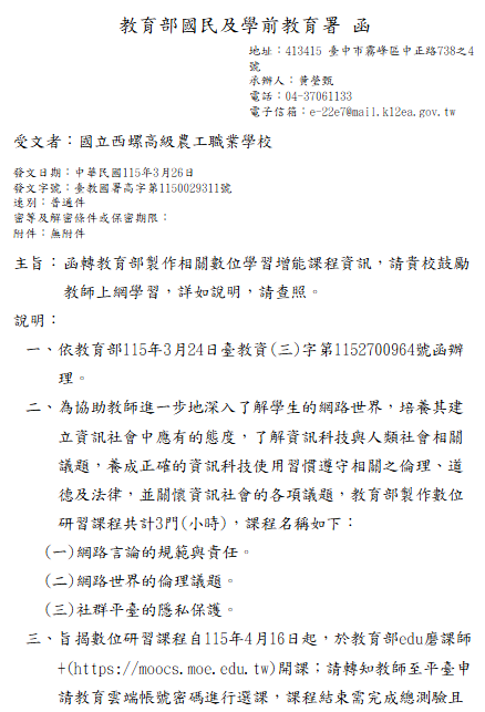 轉知-教育部製作相關數位學習增能課程資訊 瀏覽次數: 7Post author:hlvs203Post published:2026-03-31Post category:研習活動Read more articles上一篇文章國家圖書館與科林研發於本(115)年4月11日共同主辦2026年春季閱讀系列講座,邀請高雄醫學大學語言與文化中心鄭智仁副教授演講,主題為「介入、疏離與變形──臺灣現代詩的現實書寫」,於國立成功大學圖書館舉行下一篇文章轉知-臺中市立臺中工業高級中等學校辦理新興科技生成式AI主題系列研習課程相關內容教育部高級中等學校美術學科中心「111學年度東區教師專業成長研習-藝術與在地文化的交會與創生」實施計畫1份,請各主管機關轉知所屬學校、教師,鼓勵高中美術教師、參與。2023-05-10國立嘉義女子高級中學歷史學科中心、人權教育資源中心及臺中一中「『誰的』?東南亞」合科共備社群聯合辦理111學年度「柬埔寨專題」工作坊(如附件),鼓勵社會科、跨領域課程教師踴躍報名參加。2022-10-26