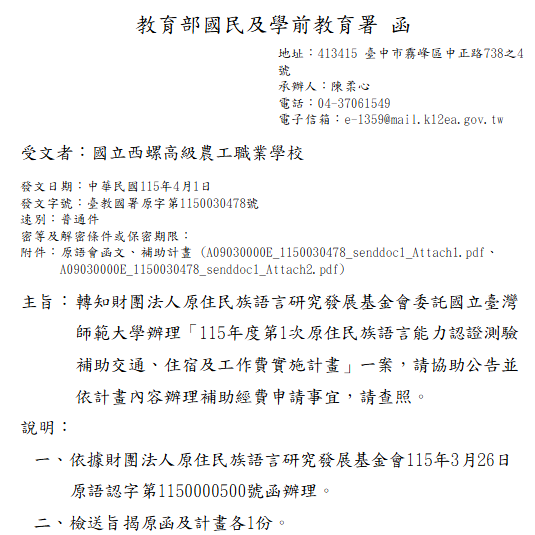 轉知-115年度第1次原住民族語言能力認證測驗補助交通、住宿及工作費實施計畫115年度第1次原住民族語言能力認證測驗補助交通、住宿及工作費實施計畫_Attach1下載115年度第1次原住民族語言能力認證測驗補助交通、住宿及工作費實施計畫_Attach2下載 瀏覽次數: 6Post author:hlvs203Post published:2026-04-01Post category:宣導資訊Read more articles上一篇文章轉知-「來上客-12年國教客語文學習入口網站」全國競賽活動下一篇文章轉知-「2026台積電盃青年尬科學」競賽相關內容中原大學財務金融學系舉辦「2025中原大學第二屆財務金融學系現金流大賽2024-11-27展現行動創造希望-凝聚力量守護生命2023-06-15
