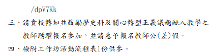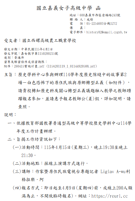 轉知-歷史學科中心辦理114學年度歷史隙縫中的故事第2場-白色恐怖下的原住民族與原鄉轉型正義報名方式:即日起至4月9日(星期四)前,或線上200人額滿為止,不開放臨時報名)。網址:https://reurl.cc/dpV7Kk白色恐怖下的原住民族與原鄉轉型正義下載 瀏覽次數: 8Post author:hlvs203Post published:2026-04-02Post category:研習活動Read more articles上一篇文章轉知-校園開放文件格式(ODF)推廣研習課程相關內容轉知-新太空・新課綱:高中教育落地與教材共創論壇2025-12-17國立臺灣工藝研究發展中心辦理「110年校園工藝種子教師研習營-編織班」招生簡章各1份,請教師踴躍報名參與。2021-11-10