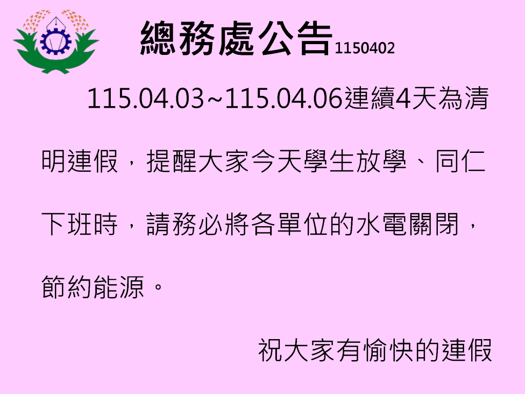 總務處公告-清明連假,請務必將各單位水電關閉 瀏覽次數: 9Post author:hlvs606Post published:2026-04-02Post category:重要公告Read more articles上一篇文章本校114學年度第2次招僱國立高級中等學校資源班行政助理錄取名單相關內容教師倘違反跟蹤騷擾防制法,依說明辦理2022-02-07進修部112學年度第2學期補考名單2024-07-03