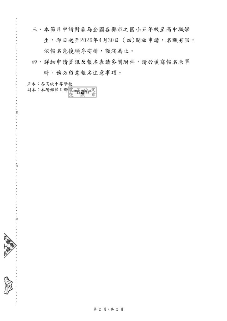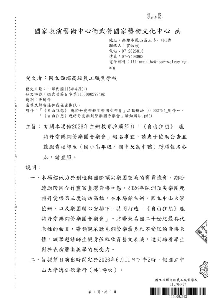 【轉知】國家表演藝術中心衛武營國家藝術文化中心2026年主辦教育推廣節目「《自由狂想》 鹿特丹愛樂銅管樂團音樂會」《自由狂想》鹿特丹愛樂銅管樂團音樂會」活動辦法下載 瀏覽次數: 7Post author:hlvs302aPost published:2026-04-07Post category:學生訊息Read more articles上一篇文章【轉知】教育部國民及學前教育署「第8屆高級中等學校學生代表與署長有約活動」延長報名時間至115年4月22日(星期三)止下一篇文章【彈性課程】114-2綜高二、技高二彈性課程「B段」分發結果公告相關內容(轉知)逢甲大學建築專業學院進修學士班招生資訊。2022-08-01國立虎尾科技大學44週年校慶演唱會」宣傳2024-11-14