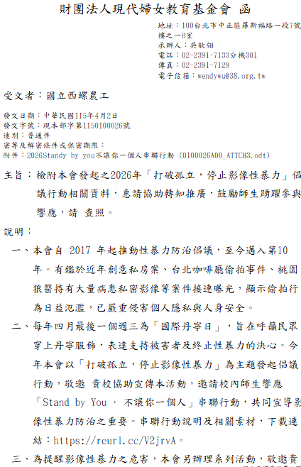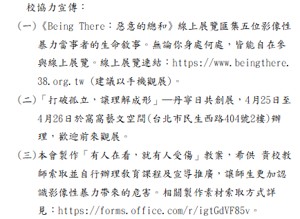 轉知-現代婦女教育基金會2026年「打破孤立,停止影像性暴力」倡議行動相關資料串聯行動說明及相關素材,下載連結:https://reurl.cc/V2jrv。線上展覽連結:https://www.beingthere.38.org.tw (建議以手機觀展)。「有人在看,就有人受傷」教案,相關製作素材索取方式詳見:https://forms.office.com/r/igtGdVF85v。 瀏覽次數: 9Post author:hlvs203Post published:2026-04-07Post category:宣導資訊 / 教職員公告Read more articles上一篇文章轉知-檢送教育部教師諮商輔導支持中心115年馨訟月「雲支持線上講座」實施計畫1份。下一篇文章轉知-國立雲林科技大學財務金融系博士班入學招生資訊相關內容轉知法務部廉政署已建置「廉潔教材資料庫網站」,請多加推廣利用2025-01-15113學年度教育部國民及學前教育署身心障礙學生鑑定中心專業工作人員第二次遴選簡章2024-08-27