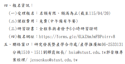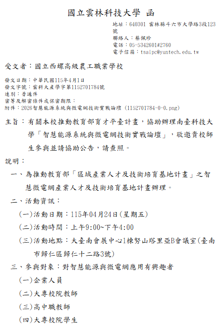 轉知-國立雲林科技大學協助辦理南臺科技大學「智慧能源系統與微電網技術實戰論壇」報名資訊:受理報名:名額有限、額滿為止(截至115/04/20)課程費用:免費(中午備有午餐)研習證書:全程參與者發予6小時研習證明報名網址:https://forms.gle/6LkZAmJmFBPoirrv8 瀏覽次數: 8Post author:hlvs203Post published:2026-04-07Post category:研習活動Read more articles上一篇文章轉知-114學年度技術型高級中等學校商業與管理群科中心教師研習(八)「因應產業新技術、科技及議題增能研習(二)人工智慧應用實作×教學資源推廣」下一篇文章轉知-教育部委請國立臺灣師範大學辦理115年「素養導向音樂專才教材研發與師資精進暨跨域競爭力培育計畫」之全國音樂教師專業成長工作坊「AI生成應用於影音創作之技術、心法與省思」相關內容轉知-教育部委請國立臺灣師範大學辦理115年「素養導向音樂專才教材研發與師資精進暨跨域競爭力培育計畫」之全國音樂教師專業成長工作坊「AI生成應用於影音創作之技術、心法與省思」2026-04-07歷史學科中心參與辦理114學年度【跨領域探究與實作專題】災難與人文的距離—新聞議題如何引導多元思考?2025-11-17
