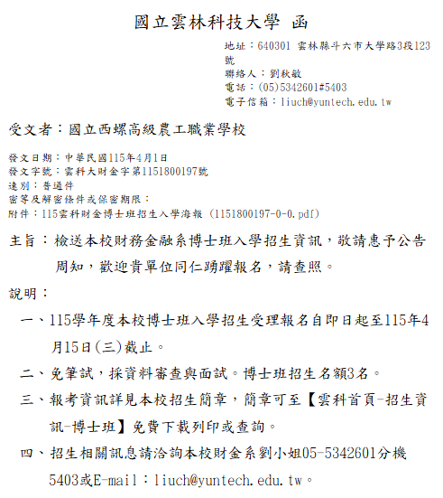 轉知-國立雲林科技大學財務金融系博士班入學招生資訊 瀏覽次數: 11Post author:hlvs203Post published:2026-04-07Post category:教職員公告Read more articles上一篇文章轉知-現代婦女教育基金會2026年「打破孤立,停止影像性暴力」倡議行動相關資料下一篇文章轉知-112年至115年全國公教員工旅遊平安卡優惠方案,調整個人保險專案組合相關內容轉知-2026年「外語能力測驗」(FLPT)與「外語能力測驗-歐日語基礎級」(FLPT-Basic)報名資訊2026-02-26財團法人技專校院入學測驗中心基金會辦理「114年度統一入學測驗試題研討會」相關事項,轉知本教教師參與。2025-05-28