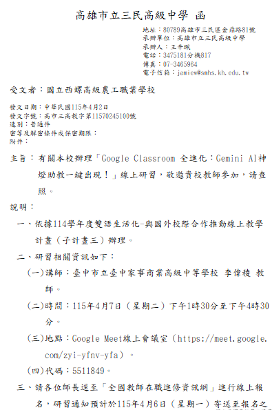 轉知-「Google Classroom 全進化:Gemini AI神燈助教一鍵出現!」線上研習 瀏覽次數: 7Post author:hlvs203Post published:2026-04-07Post category:研習活動Read more articles上一篇文章學生爆發型行為處理策略課程研習下一篇文章轉知-「高級中等學校教師本土語文認證培訓實施計畫─第二十一梯次本土語文認證輔導班」相關內容中央研究院邀請國際知名量子物理學家約翰.馬汀尼斯博士(Dr. John Martinis)擔任2023年度「中央研究院講座」講者發表專題演講。2023-04-19國立臺中教育大學辦理112年3月「原住民族教育師資修習原住民族文化及多元文化教育課程」實體研習場次報名資訊,請教師踴躍報名。2023-02-21