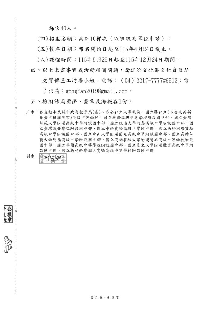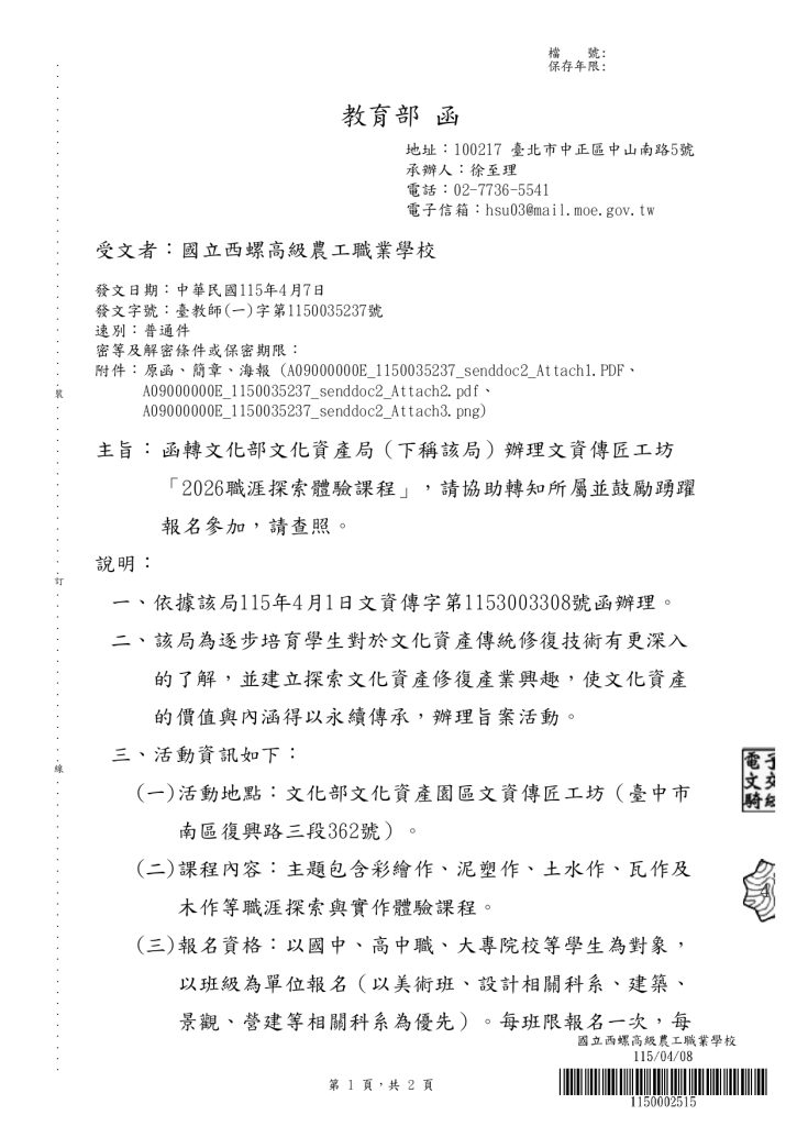【轉知】文化部文化資產局辦理文資傳匠工坊「2026職涯探索體驗課程」文化部文化資產局-函下載 瀏覽次數: 7Post author:hlvs302aPost published:2026-04-08Post category:學生訊息Read more articles上一篇文章【轉知】致理學校財團法人致理科技大學通識教育學部辦理「2026年全國大專校院SDGs議題短講競賽」下一篇文章【轉知】國立虎尾科技大學辦理115年度「生醫工程是甚麼?細胞影像分析夏令營」相關內容國立北港高級中學雲一區自主學習成果展學生以錄影方式呈現成果,影片已上傳於youtube,敬邀本校師生觀賞。2022-06-17龍華科技大學辦理「2024龍華科大金融投資競賽」相關資訊2024-02-19