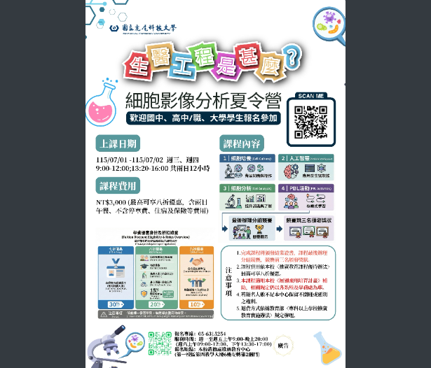 【轉知】國立虎尾科技大學辦理115年度「生醫工程是甚麼?細胞影像分析夏令營」國立虎尾科技大學-函下載 瀏覽次數: 6Post author:hlvs302aPost published:2026-04-08Post category:學生訊息Read more articles上一篇文章【轉知】文化部文化資產局辦理文資傳匠工坊「2026職涯探索體驗課程」下一篇文章【轉知】龍華科技大學辦理「2026全國大專校院暨高中職生物多樣性‧永續未來短影音行銷競賽」相關內容嘉藥學校財團法人嘉南藥理大學推廣教育中心謹訂於114年1月22、23日辦理「2025嘉藥社工冬令營」2025-01-09國立臺北科技大學與南臺科技大學合作辦理113年「永續能源探索營職能深化課程」資訊2024-05-27