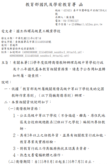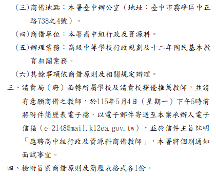 轉知-教育部國民及學前教育署115學年度徵聘商借教師辦理高級中等學校行政及十二年國民基本教育相關業務事宜教育部國民及學前教育署115學年度徵聘商借教師辦理高級中等學校行政及十二年國民基本教育相關業務_Attach1下載教育部國民及學前教育署115學年度徵聘商借教師辦理高級中等學校行政及十二年國民基本教育相關業務_Attach2下載 瀏覽次數: 7Post author:hlvs203Post published:2026-04-08Post category:教職員公告Read more articles上一篇文章轉知-「苗栗縣115學年度高級中學校長遴選須知」1份。下一篇文章【教務處公告】114學年度第2學期第一次期中評量成績輸入截止提醒相關內容轉知國立中央大學第二次公開徵求附屬中壢高級中學第四任校長候選人2025-03-31財團法人大學入學考試中心基金會大學入學考試中心辦理「試題研討暨試務交流」會議,歡迎本校教師報名參加。2024-03-29