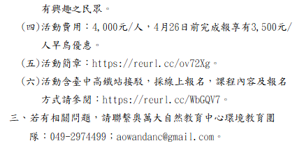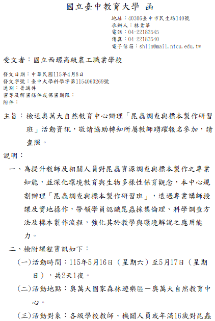 轉知-奧萬大自然教育中心辦理「昆蟲調查與標本製作研習班」 瀏覽次數: 2Post author:hlvs203Post published:2026-04-08Post category:宣導資訊 / 研習活動Read more articles上一篇文章轉知-「115年度原住民族文化教案設計共創工作坊」實施計畫下一篇文章轉知-「雲菁人才培育計畫-品牌風格與包裝美學系列課程」活動資訊相關內容轉知-全國高中英語辯論比賽區域賽2026-03-17敬邀 師生共同參與「2022校園丹寧日-相信,現在發聲」性暴力防治倡議行動2022-04-22