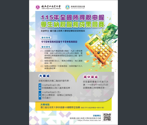 【轉知】國立臺北商業大學辦理「115年全國所得稅申報學生納稅服務成果競賽」國立臺北商業大學-函下載115年全國所得稅申報學生納稅服務成果競賽要點下載 瀏覽次數: 10Post author:hlvs302aPost published:2026-04-08Post category:學生訊息Read more articles上一篇文章【轉知】高雄醫學大學擬於115年7月4日(星期六)至7月9日(星期四)舉辦醫學營活動下一篇文章【轉知】國立臺中教育大學辦理「2026全國高中職科學、科學遊戲與玩具創意設計、科學議題與傳播競賽」相關內容關於111年度全縣語文競賽縣賽報名注意事項2022-07-08【轉知】臺北醫學大學【Coursera Pro空中飛行研習課程】2026-01-12