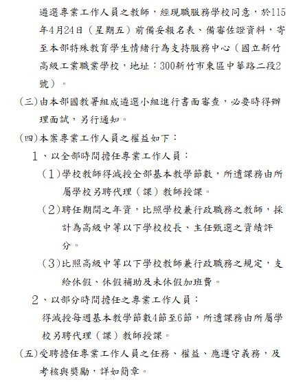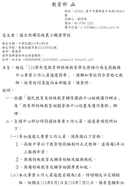 轉知-「115學年度教育部特殊教育學生情緒行為支持服務中心專業工作人員遴選簡章」115學年度教育部特殊教育學生情緒行為支持服務中心專業工作人員遴選簡章下載 瀏覽次數: 8Post author:hlvs203Post published:2026-04-08Post category:教職員公告Read more articles上一篇文章【教務處公告】114學年度第2學期第一次期中評量成績輸入截止提醒下一篇文章轉知-國家住宅及都市更新中心辦理新北市、桃園市、苗栗縣、雲林縣、高雄市、臺東縣社會住宅招租一案相關內容國立高雄師範大學性別教育研究所辦理「性別力培訓工作坊」活動海報與報名資訊2023-11-16輔仁大學師資培育中心舉辦「2022不只是環境教育:在大自然中感動與行動」工作坊,請教師及相關人員踴躍報名參加。2022-06-17