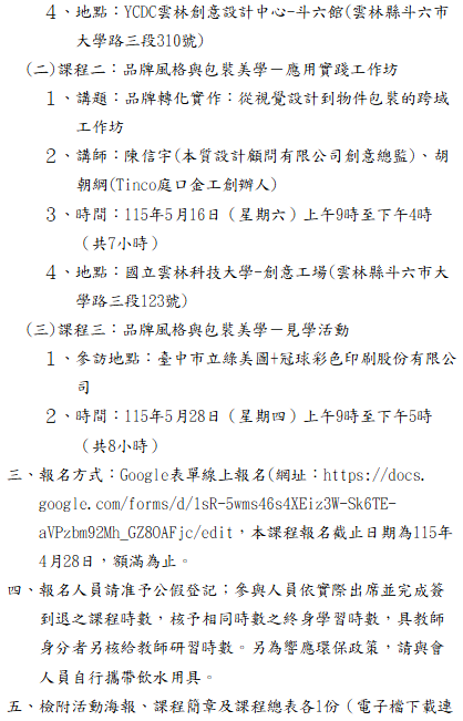 轉知-「雲菁人才培育計畫-品牌風格與包裝美學系列課程」活動資訊Google表單線上報名網址:https://docs.google.com/forms/d/1sR-5wms46s4XEiz3W-Sk6TE-aVPzbm92Mh_GZ8OAFjc/edit電子檔下載連結:https://drive.google.com/drive/folders/11cwaaRflrcf6NcogiudDxti5DXPGNiiB 瀏覽次數: 2Post author:hlvs203Post published:2026-04-08Post category:研習活動Read more articles上一篇文章轉知-奧萬大自然教育中心辦理「昆蟲調查與標本製作研習班」相關內容本校辦理「EMI: What? So What? Now What?」實體工作坊相關資訊,敬請貴校惠予公告周知,鼓勵教職員報名參加。2022-10-11國立彰化師範大學進修學院推廣教育課程「PlayingCards線上桌遊設計應用班(線上課程)」、「【有效達成目標】NLP目標設定與展開行動工作坊」、「課後才藝安親照顧培訓師乙級鑑定輔導班」、「魔術星空數學師資培訓工作坊」、「【讓光進來】心靈療癒工作坊」課程簡章共五門。2023-10-16