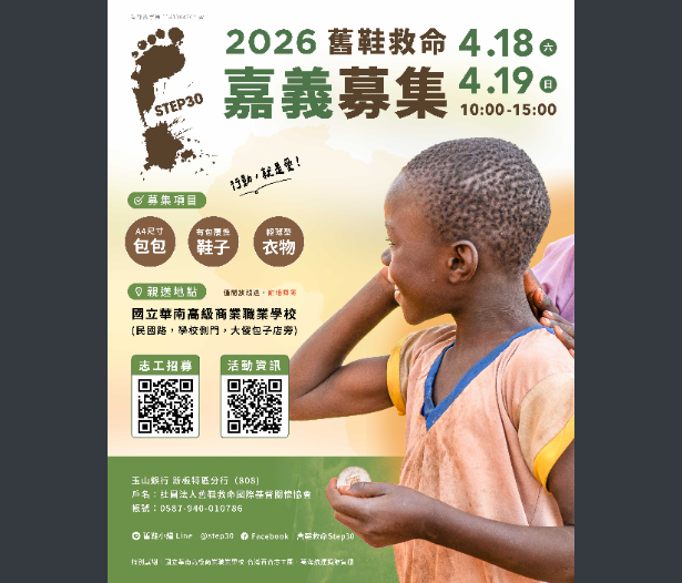 【轉知】社團法人舊鞋救命國際基督關懷協會訂於 115年04月18日(六)至04月19日(日),於國立華南高級商業職業學校舉辦「2026 舊鞋救命嘉義親送募集」活動社團法人舊鞋救命國際基督關懷協會-函下載 瀏覽次數: 3Post author:hlvs302aPost published:2026-04-10Post category:學生訊息Read more articles上一篇文章【轉知】臺北市藝文推廣處大稻埕戲苑舉辦《請戲─布袋戲一條街》特展相關內容【轉知】崑山科技大學資訊傳播系舉辦「思科CCST IT Support 核心能力研習」2025-12-04【轉知】法務部設立法治教育測驗專區網站2026-01-30