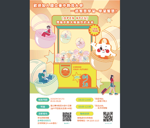 【轉知】國立臺中教育大學辦理「開箱中教大-智慧學習」學系博覽會活動國立臺中教育大學-函-1下載 瀏覽次數: 6Post author:hlvs302aPost published:2026-04-13Post category:學生訊息Read more articles上一篇文章【轉知】朝陽科技大學應用英語系辦理「大學生活一日營」相關內容雲林縣政府訂於112年10月28日(星期六)假本縣古坑鄉綠色隧道三角廣場辦理「2023年雲林縣原住民族聯合豐年祭」活動2023-10-18文藻學校財團法人文藻外語大學辦理「112年東南亞語言作文競賽」,鼓勵學生報名參加。2023-08-31
