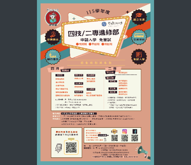 國立臺中科技大學進修部115學年度四技、二專單獨招生訊息國立臺中科技大學進修部115學年度四技、二專單獨招生訊息1下載 瀏覽次數: 4Post author:輔導室Post published:2026-04-15Post category:學生訊息 / 校園公告Read more articles上一篇文章國立勤益科技大學115學年度二專進修部(假日班)及二技進修部(假日班)獨立招生訊息下一篇文章國立臺中教育大學辦理「115年原住民族學生升大學輔導講座II-四技二專進路攻略解析篇」實施計畫相關內容台南應用科技大學112學年度重點運動項目績優學生單獨招生.2023-03-14【轉知】中央研究院參與「臺灣橋梁計畫」(TAIWAN BRIDGES)邀請諾貝爾和平獎得主娜蒂雅.穆拉德女士(Ms. Nadia Murad)蒞院發表專題演講2025-11-27