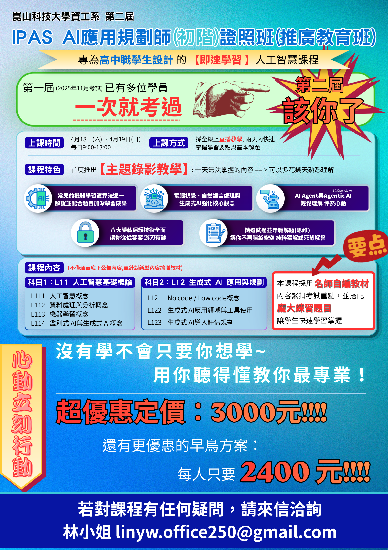 一、為因應國內人工智慧人才需求,本校資訊工程系特開設「iPAS AI應用規劃師 (初階)證照班」,協助學生打好人工智慧基礎知識,並取得國家推動之IPAS AI應用規劃師(初階)證照,課程詳情如下: