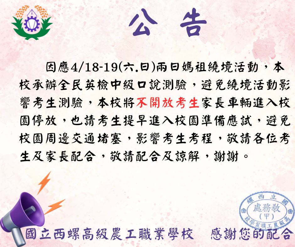 因應媽祖繞境1150418-19全民英檢口說能力測驗注意事項 瀏覽次數: 154Post author:hlvs207Post published:2026-04-15Post category:-首頁公告 / 重要公告Read more articles上一篇文章資優教育教材課程研習0604下一篇文章【高三期末考】4/28(二)-4/29(三)辦理高三期末畢業考,試題卷請於4月21日(星期二)中午12:00前交教務處,逾期請自行印製班級人數+3份,感謝配合。(修改1次)相關內容特殊群體資優學生發掘與輔導知能研習2026-02-13特教研習-學習策略教材課程研習2025-02-21