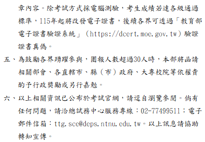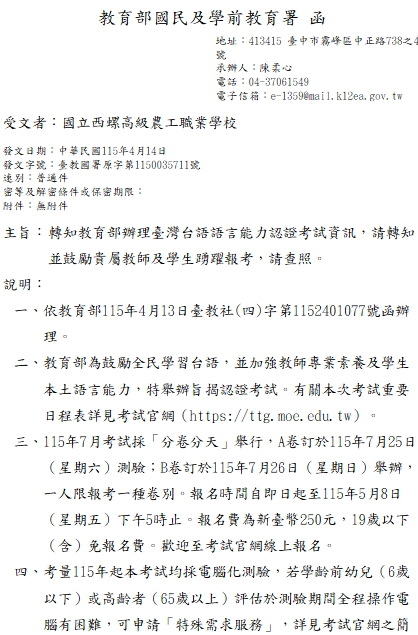 轉知-教育部辦理臺灣台語語言能力認證考試資訊考試官網:https://ttg.moe.edu.tw 瀏覽次數: 10Post author:hlvs203Post published:2026-04-15Post category:學生訊息 / 宣導資訊 / 教職員公告Read more articles上一篇文章轉知-東莞台商子弟學校115學年度第二次商借公立高級中等以下學校教師簡章下一篇文章寶佳教育大愛獎相關內容【轉知】內政部國家公園署玉山國家公園管理處於115年寒假期間辦理「2026年玉山國家公園YouthCamp『拉庫拉庫蕨之旅』」營隊活動2026-01-15「元宇宙一級玩家~與祖克柏的對話」2022-02-21