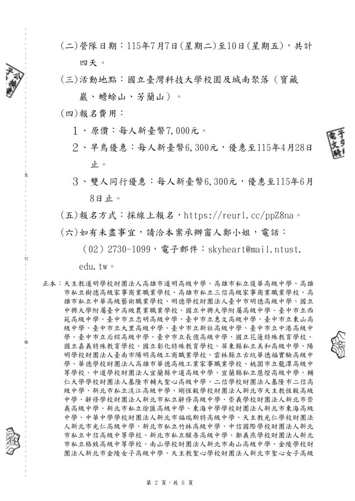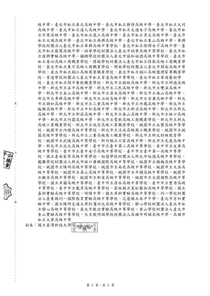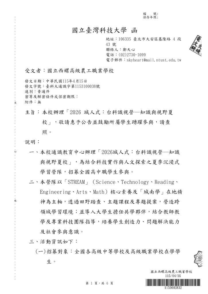 【轉知】國立臺灣科技大學辦理「2026 城人式:台科識視營─知識與視野夏校」 瀏覽次數: 9Post author:hlvs302aPost published:2026-04-16Post category:學生訊息Read more articles上一篇文章115學年度四技二專統一入學測驗考生應考相關試務作業規定下一篇文章【轉知】國立臺灣大學「115年全國夏季學院暑期通識課程海報」及「115年全國夏季學院課程清單」電子檔相關內容轉知-國立臺灣師範大學英語學系辦理115年「英語辯論評判知能線上講座」2026-03-06【轉知】國立臺灣藝術教育館「2026年全國學生圖畫書創作獎」徵選簡章及相關書表各1份2026-01-20