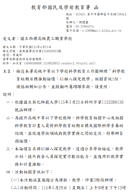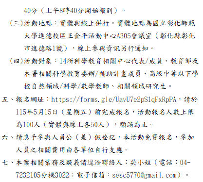 轉知-國教署高級中等以下學校科學教育工作圈辦理「科學教育短期目標推動論壇:AI融入探究教學」報名網址:https://forms.gle/UavU7e2pS1qFxRpPA,請於115年5月15日(星期五)前完成報名,活動報名人數上限為100人(實體與線上各50人),額滿為止。科學教育短期目標推動論壇:AI融入探究教學_Attach1下載 瀏覽次數: 8Post author:hlvs203Post published:2026-04-16Post category:研習活動Read more articles上一篇文章轉知-114學年度高級中等學校安全教育師資增能研習實施計畫下一篇文章轉知-「115年度高級中等學校原住民族學生科學人才培訓計畫」暑假培訓說明會相關內容僑光科技大學研發處大學社會責任計畫辦公室舉辦「2023 Linker無限可能-全國高級中等學校小論文作文競賽X大學社會責任實踐計畫~北八卦山脈農業創新發展USR Hub計畫」,敬邀師生參與競賽。2023-10-24國立彰化師範大學進修學院推廣教育「CBM嬰幼兒撫觸按摩與知覺動作遊戲檢定班」、「DS嬰幼兒動能知覺瑜珈檢定班」、「課後才藝安親照顧培訓師乙級鑑定輔導班」非學分班招生簡章。2022-11-01