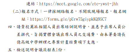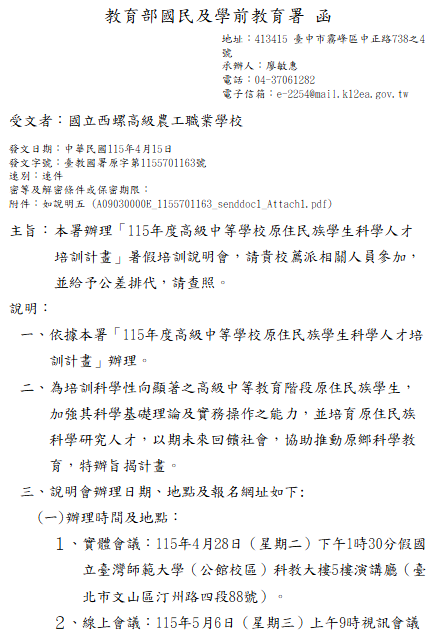 轉知-「115年度高級中等學校原住民族學生科學人才培訓計畫」暑假培訓說明會115年度高級中等學校原住民族學生科學人才培訓計畫_Attach1下載 瀏覽次數: 8Post author:hlvs203Post published:2026-04-16Post category:研習活動Read more articles上一篇文章轉知-國教署高級中等以下學校科學教育工作圈辦理「科學教育短期目標推動論壇:AI融入探究教學」下一篇文章轉知-普通型高級中等學校英語文學科中心114學年數位故事(Digital Storytelling)線上講座相關內容國立故宮博物院「『從賞玩故宮啟動教育新宇宙』–故宮文物 X 新興科技 教師共識共備及增能工作坊」實施計畫1份,鼓勵本校教師踴躍參加。2023-05-15轉知-歷史學科中心辦理114學年度歷史隙縫中的故事第2場-白色恐怖下的原住民族與原鄉轉型正義2026-04-02