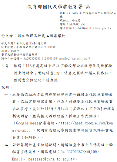 轉知-「115年度高級中等以下學校部分班級原住民族實驗教育說明會」115年度高級中等以下學校部分班級原住民族實驗教育說明會_Attach1下載 瀏覽次數: 8Post author:hlvs203Post published:2026-04-16Post category:研習活動Read more articles上一篇文章轉知-「時空學園帶你環遊世界:命題技巧無私分享」及「情境式素養題在國文科之命題設計」研習下一篇文章轉知-國教署「115年度SEL教師增能培力系列專題講座」(場次一)相關內容國立斗六高級中學辦理「數學科多元課程設計與成果產出經驗分享」講座,敬請鼓勵有興趣之教師參與研習。2022-11-11國立斗六高級中學辦理「教師增能研習:雙閱讀素養」。2023-10-06